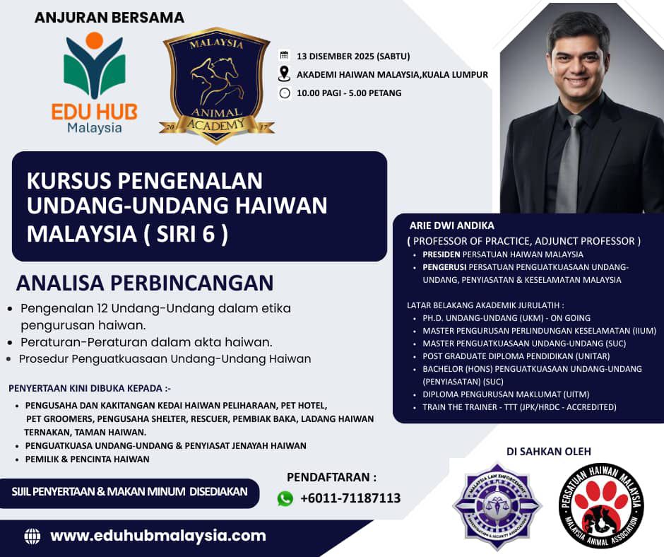 Strongly supporting Animal Laws in Malaysia, namely the Animal Welfare Act 2015 and the Wildlife Conservation Act 2010 (Amendment 2022), through the Animal Justice System by enhancing law enforcement and investigations in collaboration with animal enforcement agencies such as the Malaysian Veterinary Services Department, the Department of Wildlife and National Parks Peninsular Malaysia (PERHILITAN), and the Royal Malaysia Police (PDRM).